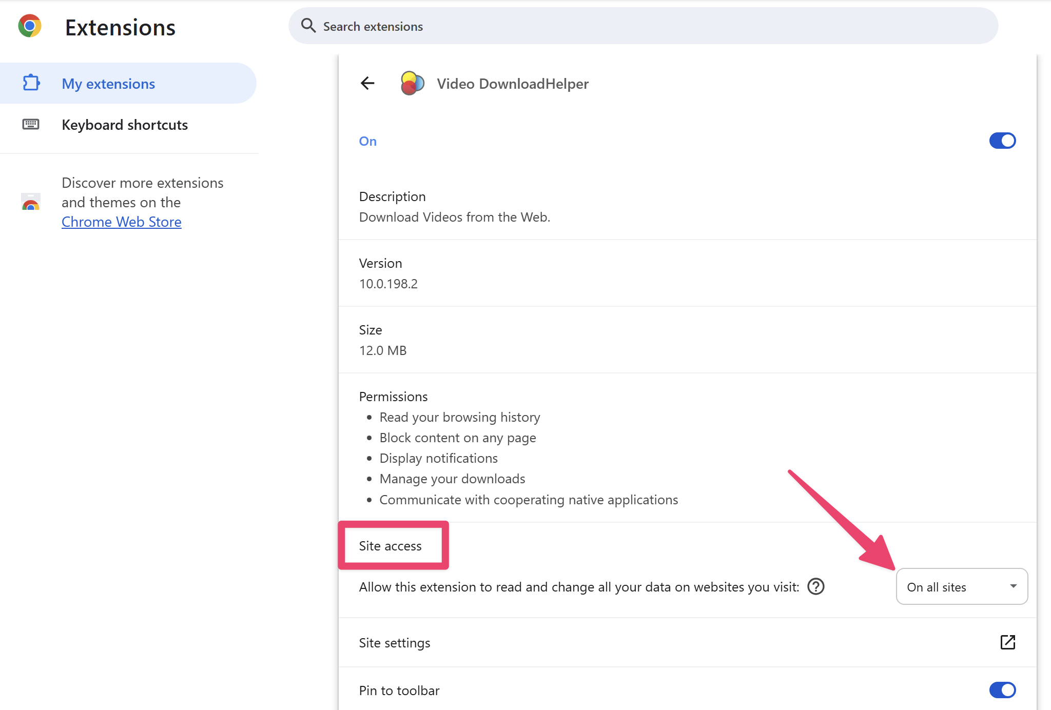 Go to extensions management and choose Video DownloadHelper, you will find a Site access section, select On all sites