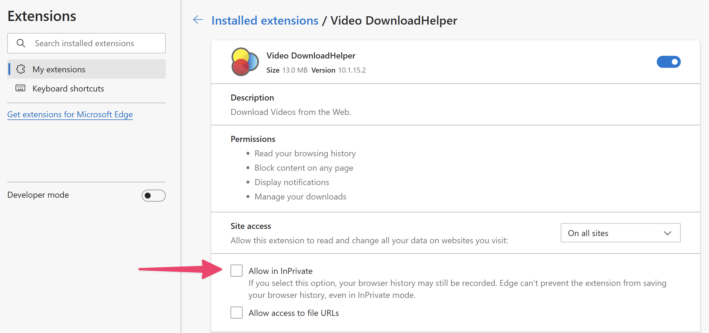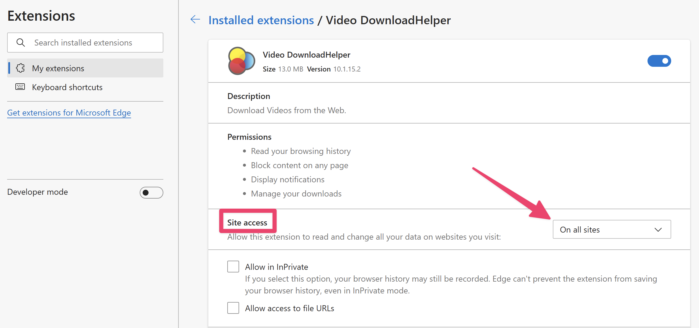 Go to extensions management and choose Video DownloadHelper, you will find a Site access section, select On all sites